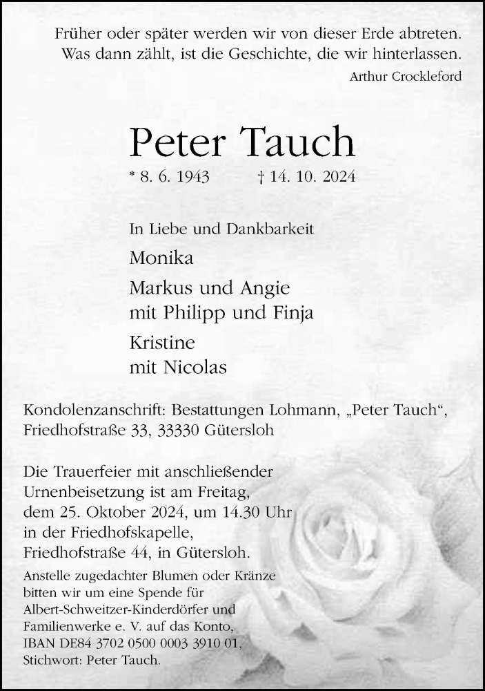 Hier finden Sie alle Traueranzeigen aus der Zeitung, die bisher für Peter Tauch erschienen sind. Weitere Traueranzeigen, die in der Zeitung erscheinen, werden hier ebenfalls aufgelistet