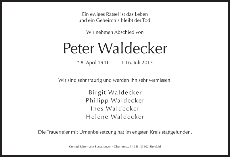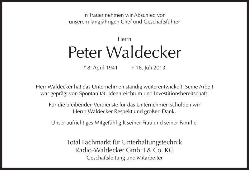 Hier finden Sie alle Traueranzeigen aus der Zeitung, die bisher für Peter Waldecker erschienen sind. Weitere Traueranzeigen, die in der Zeitung erscheinen, werden hier ebenfalls aufgelistet