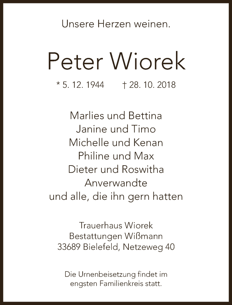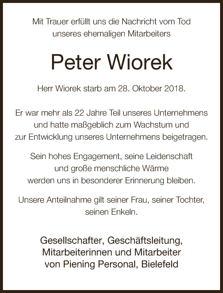 Hier finden Sie alle Traueranzeigen aus der Zeitung, die bisher für Peter Wiorek erschienen sind. Weitere Traueranzeigen, die in der Zeitung erscheinen, werden hier ebenfalls aufgelistet