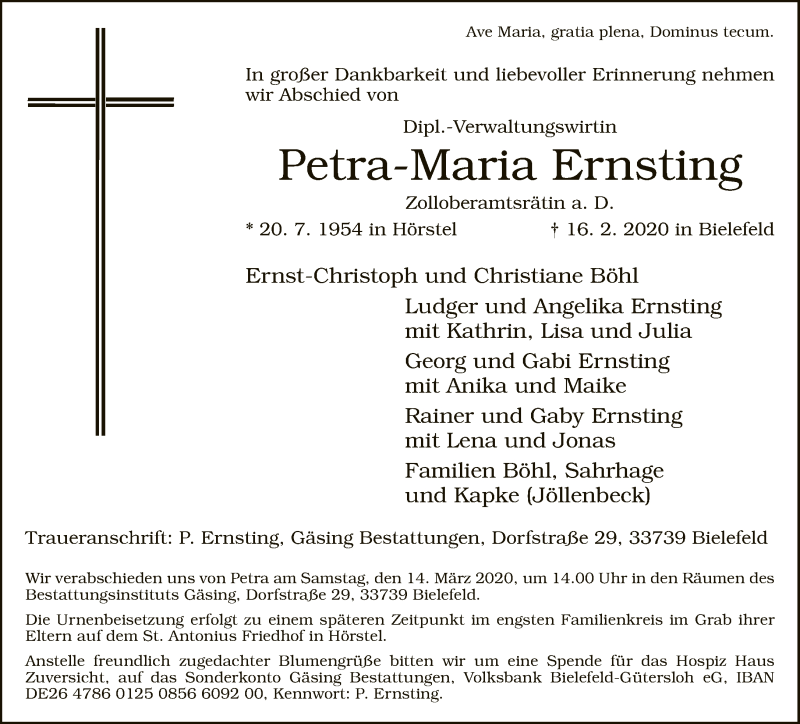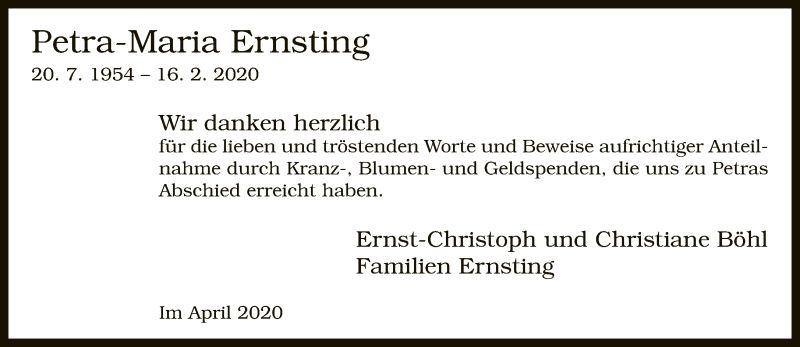 Hier finden Sie alle Traueranzeigen aus der Zeitung, die bisher für Petra-Maria Ernsting erschienen sind. Weitere Traueranzeigen, die in der Zeitung erscheinen, werden hier ebenfalls aufgelistet
