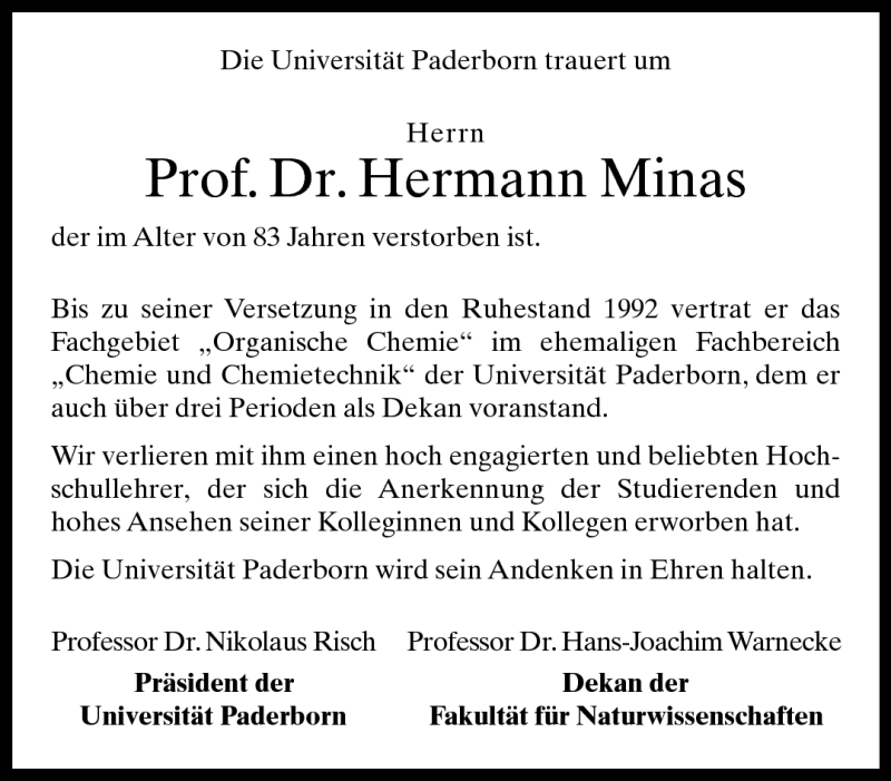 Hier finden Sie alle Traueranzeigen aus der Zeitung, die bisher für Prof. Dr. Hermann Minas erschienen sind. Weitere Traueranzeigen, die in der Zeitung erscheinen, werden hier ebenfalls aufgelistet