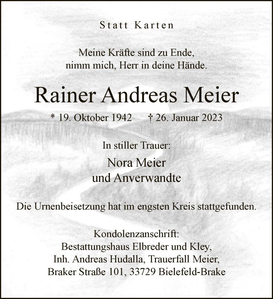 Hier finden Sie alle Traueranzeigen aus der Zeitung, die bisher für Rainer Andreas Meier erschienen sind. Weitere Traueranzeigen, die in der Zeitung erscheinen, werden hier ebenfalls aufgelistet