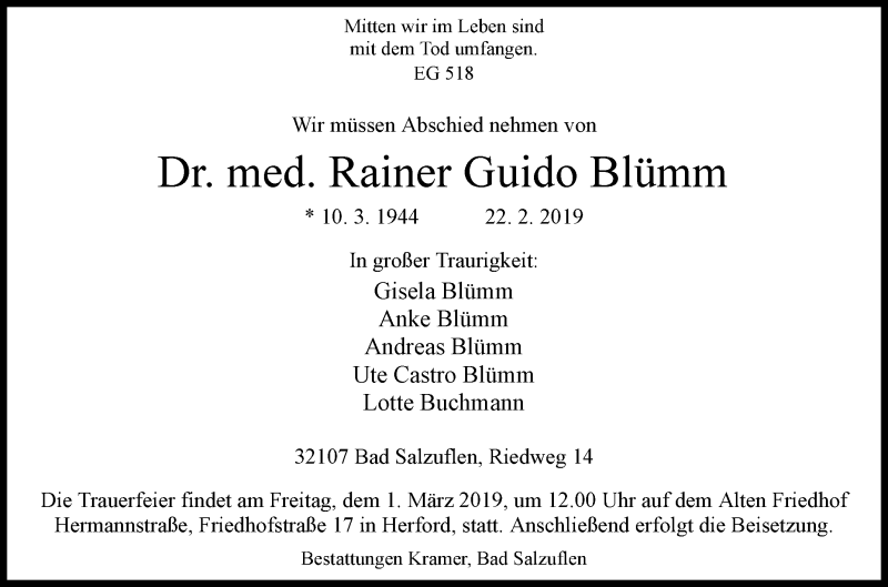 Hier finden Sie alle Traueranzeigen aus der Zeitung, die bisher für Rainer Guido Blümm erschienen sind. Weitere Traueranzeigen, die in der Zeitung erscheinen, werden hier ebenfalls aufgelistet