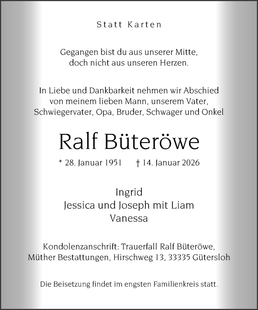 Hier finden Sie alle Traueranzeigen aus der Zeitung, die bisher für Ralf Büteröwe erschienen sind. Weitere Traueranzeigen, die in der Zeitung erscheinen, werden hier ebenfalls aufgelistet