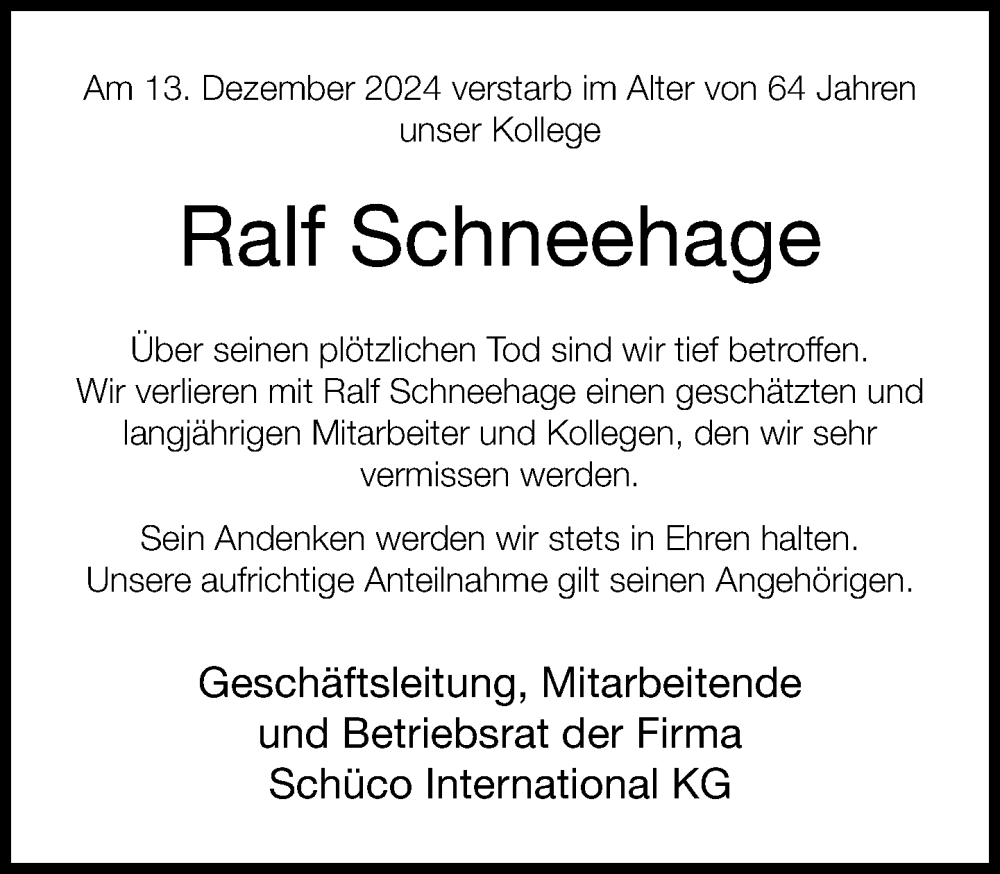 Hier finden Sie alle Traueranzeigen aus der Zeitung, die bisher für Ralf Schneehage erschienen sind. Weitere Traueranzeigen, die in der Zeitung erscheinen, werden hier ebenfalls aufgelistet
