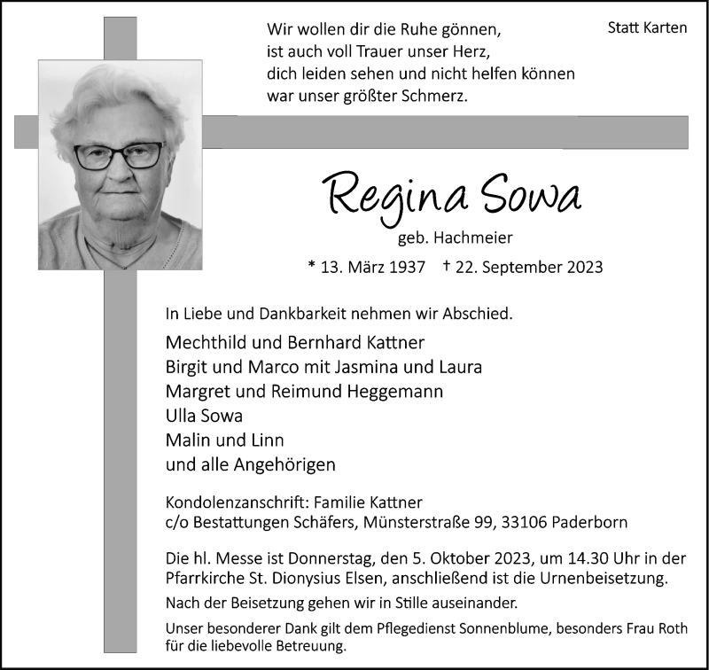 Hier finden Sie alle Traueranzeigen aus der Zeitung, die bisher für Regina Sowa erschienen sind. Weitere Traueranzeigen, die in der Zeitung erscheinen, werden hier ebenfalls aufgelistet