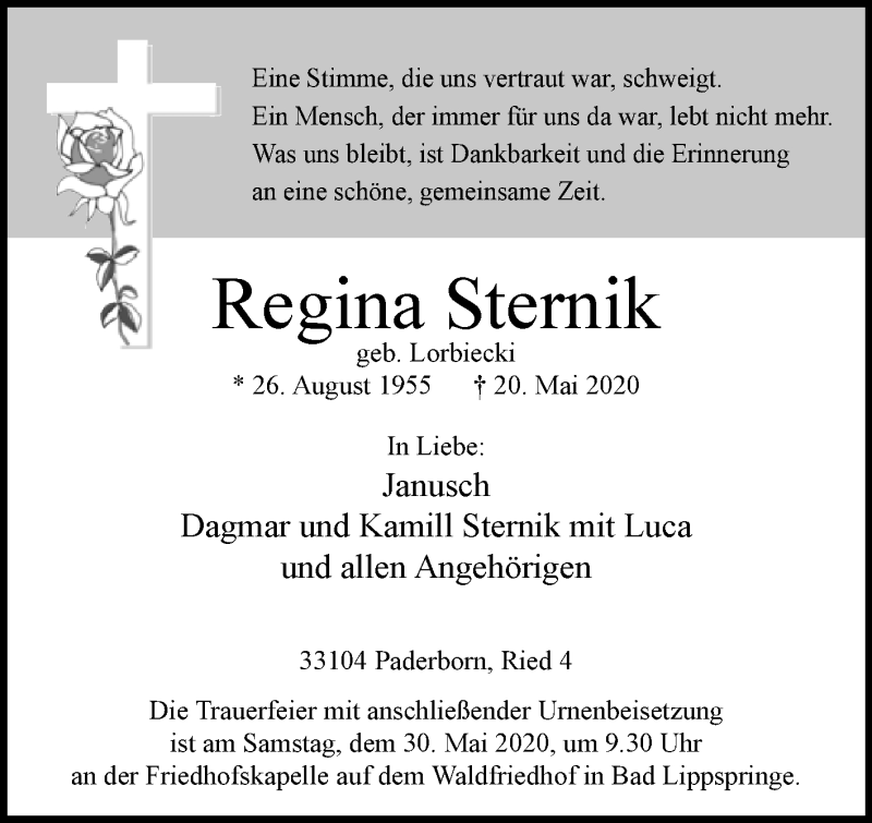 Hier finden Sie alle Traueranzeigen aus der Zeitung, die bisher für Regina Sternik erschienen sind. Weitere Traueranzeigen, die in der Zeitung erscheinen, werden hier ebenfalls aufgelistet
