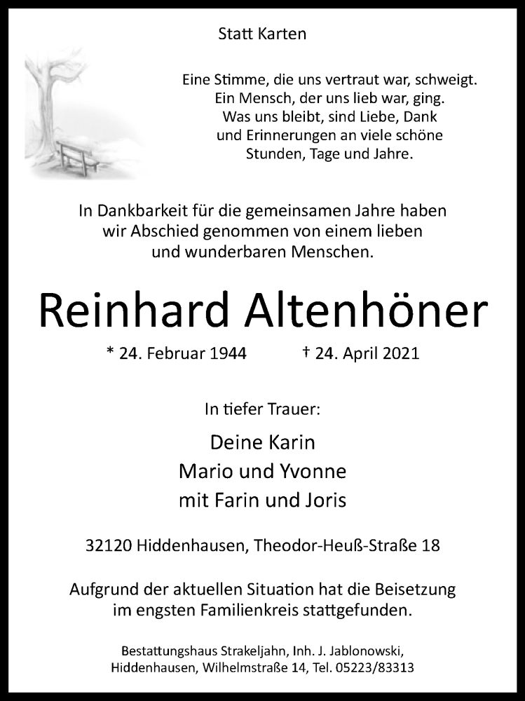 Hier finden Sie alle Traueranzeigen aus der Zeitung, die bisher für Reinhard Altenhöner erschienen sind. Weitere Traueranzeigen, die in der Zeitung erscheinen, werden hier ebenfalls aufgelistet