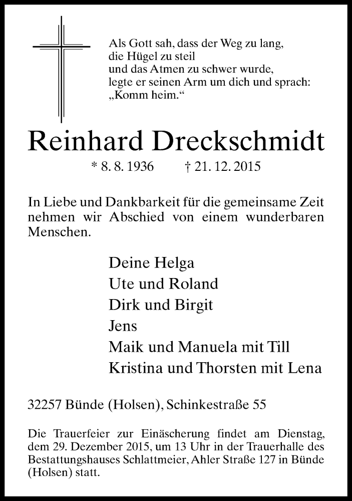 Hier finden Sie alle Traueranzeigen aus der Zeitung, die bisher für Reinhard Dreckschmidt erschienen sind. Weitere Traueranzeigen, die in der Zeitung erscheinen, werden hier ebenfalls aufgelistet