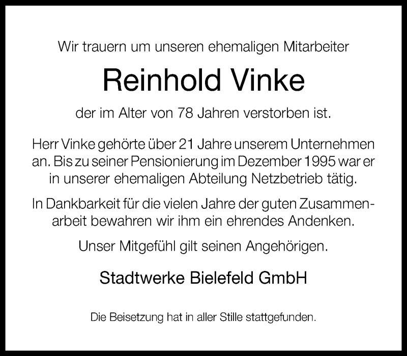 Hier finden Sie alle Traueranzeigen aus der Zeitung, die bisher für Reinhold Vinke erschienen sind. Weitere Traueranzeigen, die in der Zeitung erscheinen, werden hier ebenfalls aufgelistet