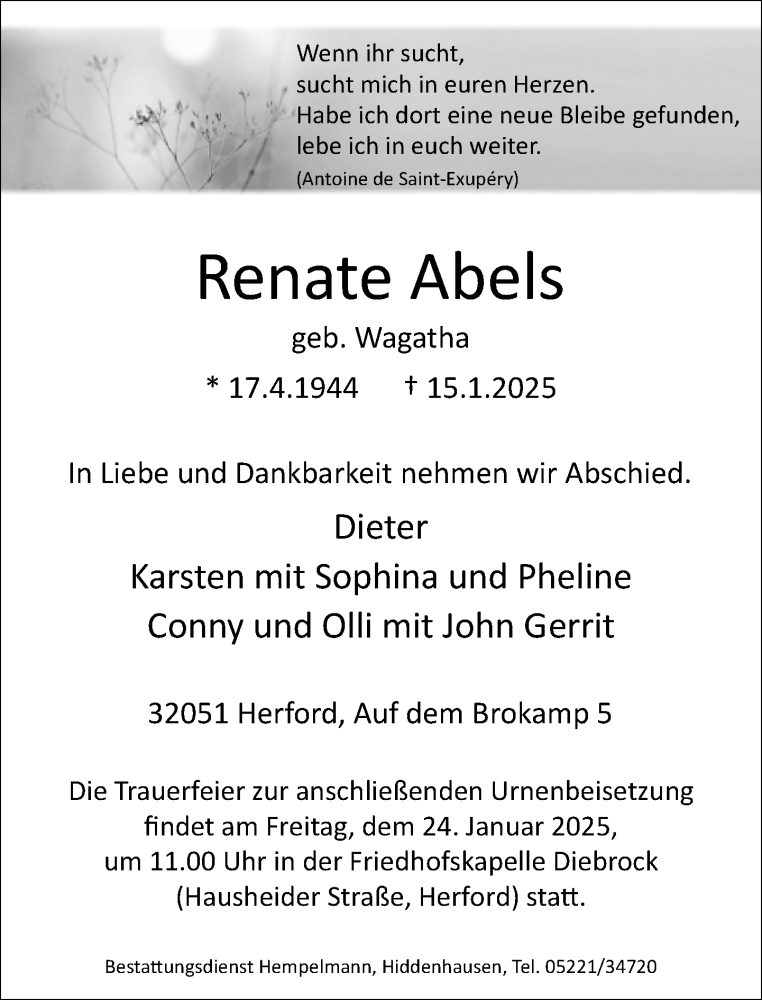 Hier finden Sie alle Traueranzeigen aus der Zeitung, die bisher für Renate Abels erschienen sind. Weitere Traueranzeigen, die in der Zeitung erscheinen, werden hier ebenfalls aufgelistet