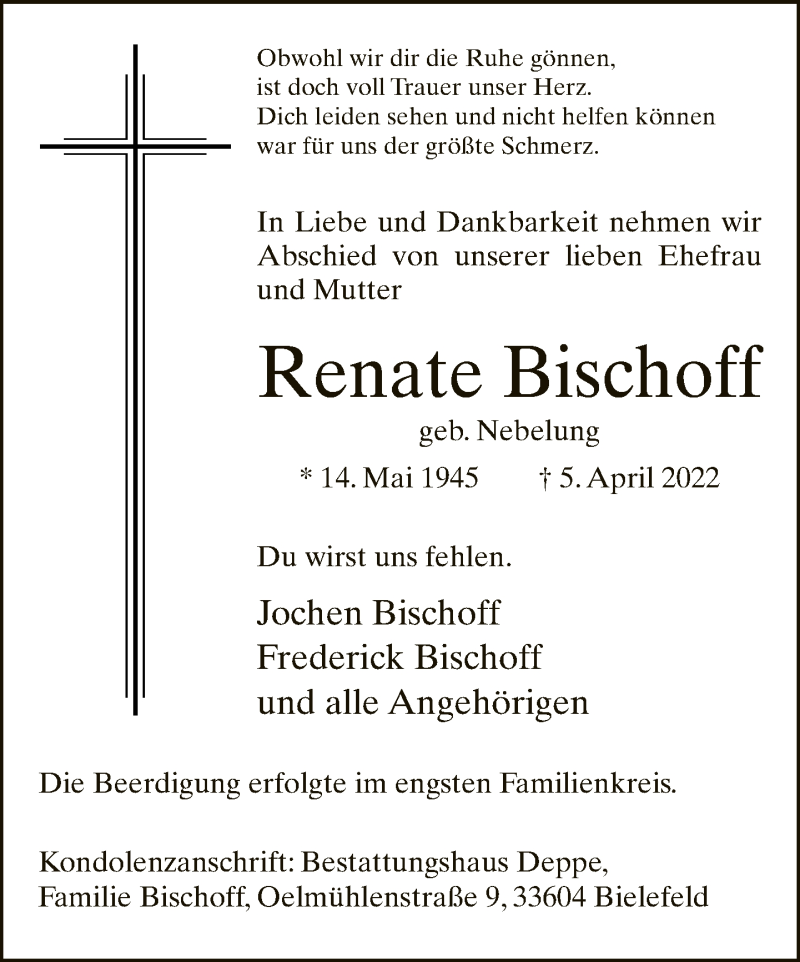 Hier finden Sie alle Traueranzeigen aus der Zeitung, die bisher für Renate Bischoff erschienen sind. Weitere Traueranzeigen, die in der Zeitung erscheinen, werden hier ebenfalls aufgelistet