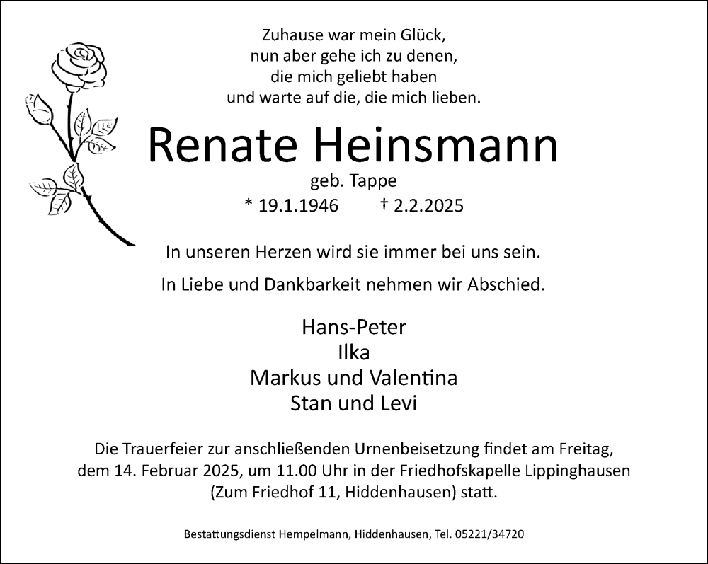 Hier finden Sie alle Traueranzeigen aus der Zeitung, die bisher für Renate Heinsmann erschienen sind. Weitere Traueranzeigen, die in der Zeitung erscheinen, werden hier ebenfalls aufgelistet
