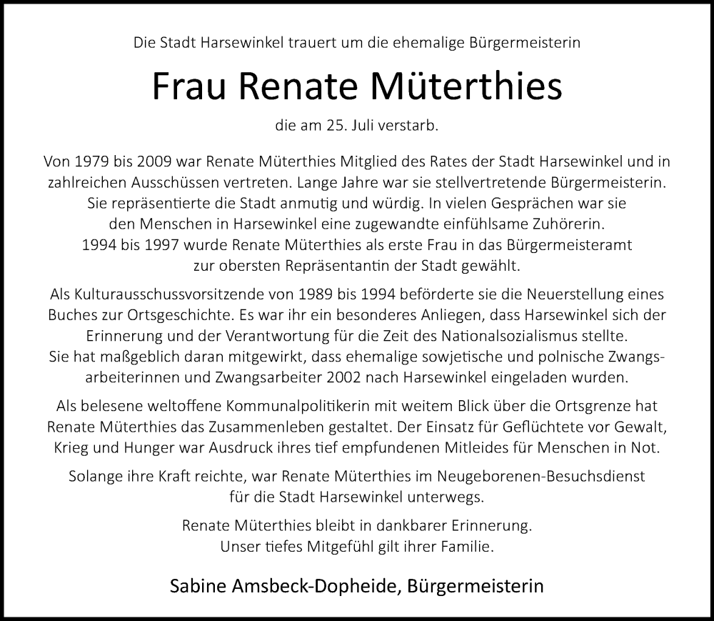 Hier finden Sie alle Traueranzeigen aus der Zeitung, die bisher für Renate Müterthies erschienen sind. Weitere Traueranzeigen, die in der Zeitung erscheinen, werden hier ebenfalls aufgelistet