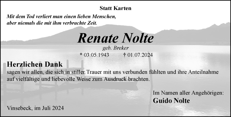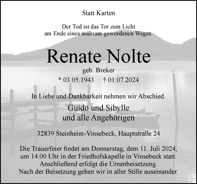 Hier finden Sie alle Traueranzeigen aus der Zeitung, die bisher für Renate Nolte erschienen sind. Weitere Traueranzeigen, die in der Zeitung erscheinen, werden hier ebenfalls aufgelistet
