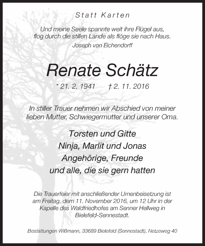 Hier finden Sie alle Traueranzeigen aus der Zeitung, die bisher für Renate Schätz erschienen sind. Weitere Traueranzeigen, die in der Zeitung erscheinen, werden hier ebenfalls aufgelistet