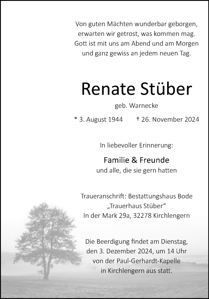 Hier finden Sie alle Traueranzeigen aus der Zeitung, die bisher für Renate Stüber erschienen sind. Weitere Traueranzeigen, die in der Zeitung erscheinen, werden hier ebenfalls aufgelistet