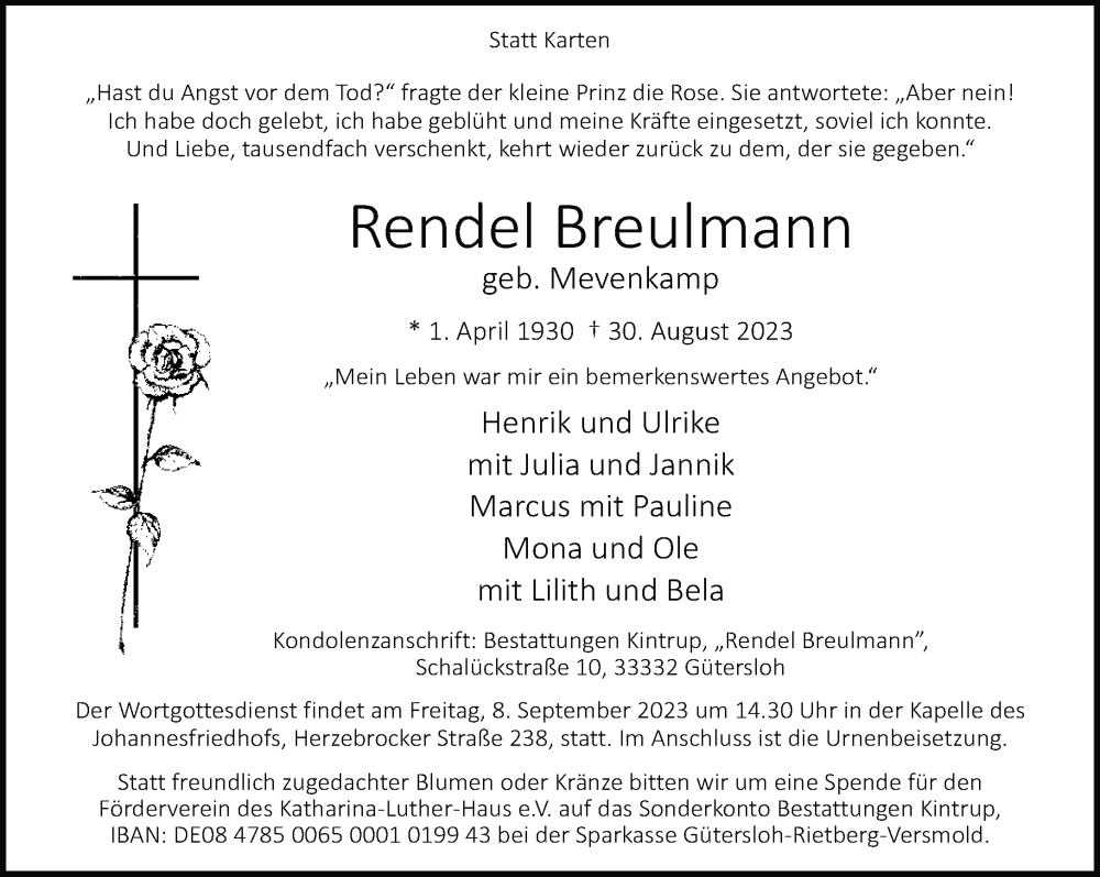 Hier finden Sie alle Traueranzeigen aus der Zeitung, die bisher für Rendel Breulmann erschienen sind. Weitere Traueranzeigen, die in der Zeitung erscheinen, werden hier ebenfalls aufgelistet