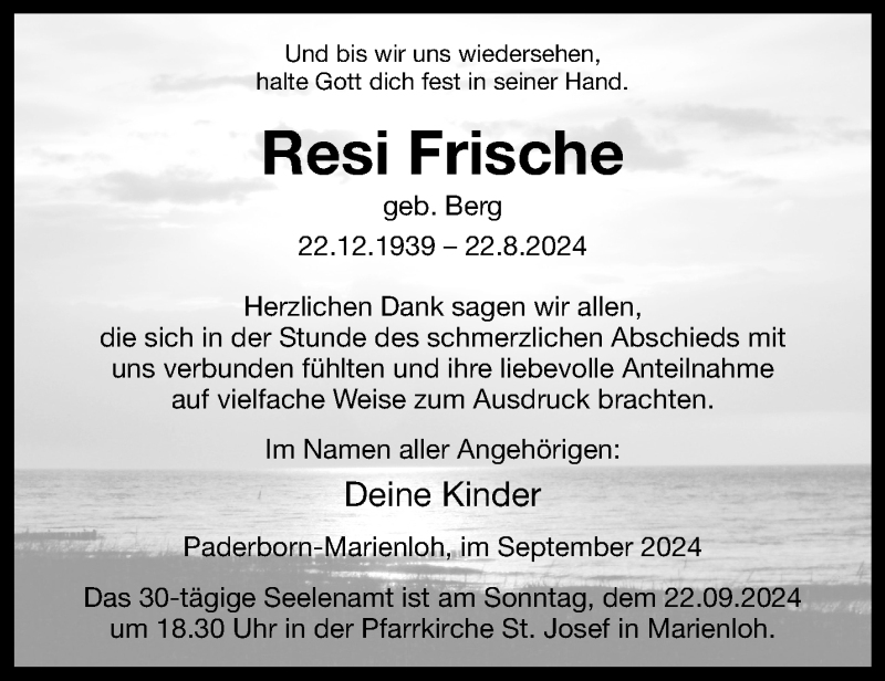 Hier finden Sie alle Traueranzeigen aus der Zeitung, die bisher für Resi Frische erschienen sind. Weitere Traueranzeigen, die in der Zeitung erscheinen, werden hier ebenfalls aufgelistet