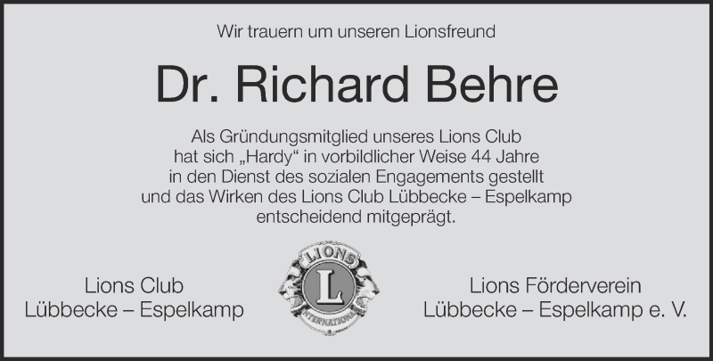 Hier finden Sie alle Traueranzeigen aus der Zeitung, die bisher für Richard Behre erschienen sind. Weitere Traueranzeigen, die in der Zeitung erscheinen, werden hier ebenfalls aufgelistet