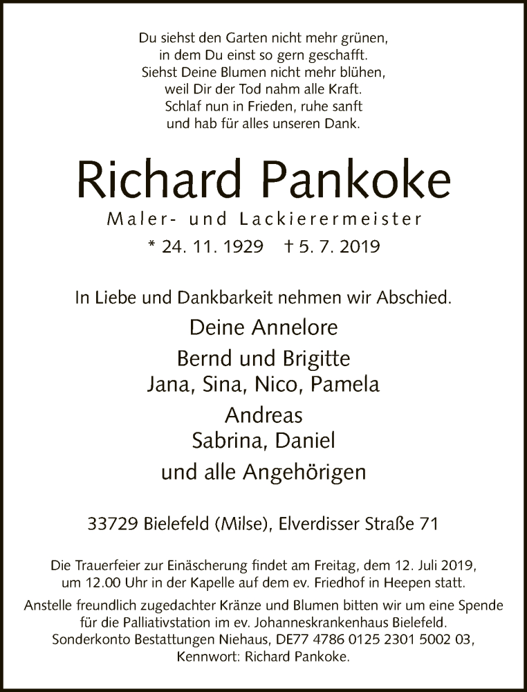 Hier finden Sie alle Traueranzeigen aus der Zeitung, die bisher für Richard Pankoke erschienen sind. Weitere Traueranzeigen, die in der Zeitung erscheinen, werden hier ebenfalls aufgelistet