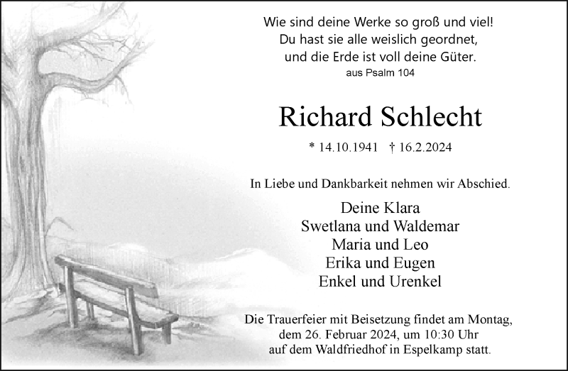 Hier finden Sie alle Traueranzeigen aus der Zeitung, die bisher für Richard Schlecht erschienen sind. Weitere Traueranzeigen, die in der Zeitung erscheinen, werden hier ebenfalls aufgelistet
