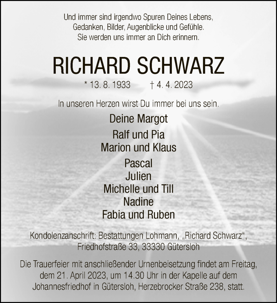 Hier finden Sie alle Traueranzeigen aus der Zeitung, die bisher für Richard Schwarz erschienen sind. Weitere Traueranzeigen, die in der Zeitung erscheinen, werden hier ebenfalls aufgelistet