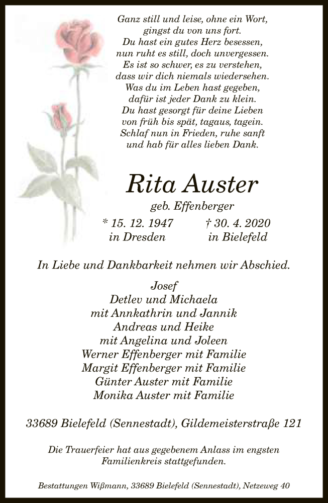 Hier finden Sie alle Traueranzeigen aus der Zeitung, die bisher für Rita Auster erschienen sind. Weitere Traueranzeigen, die in der Zeitung erscheinen, werden hier ebenfalls aufgelistet
