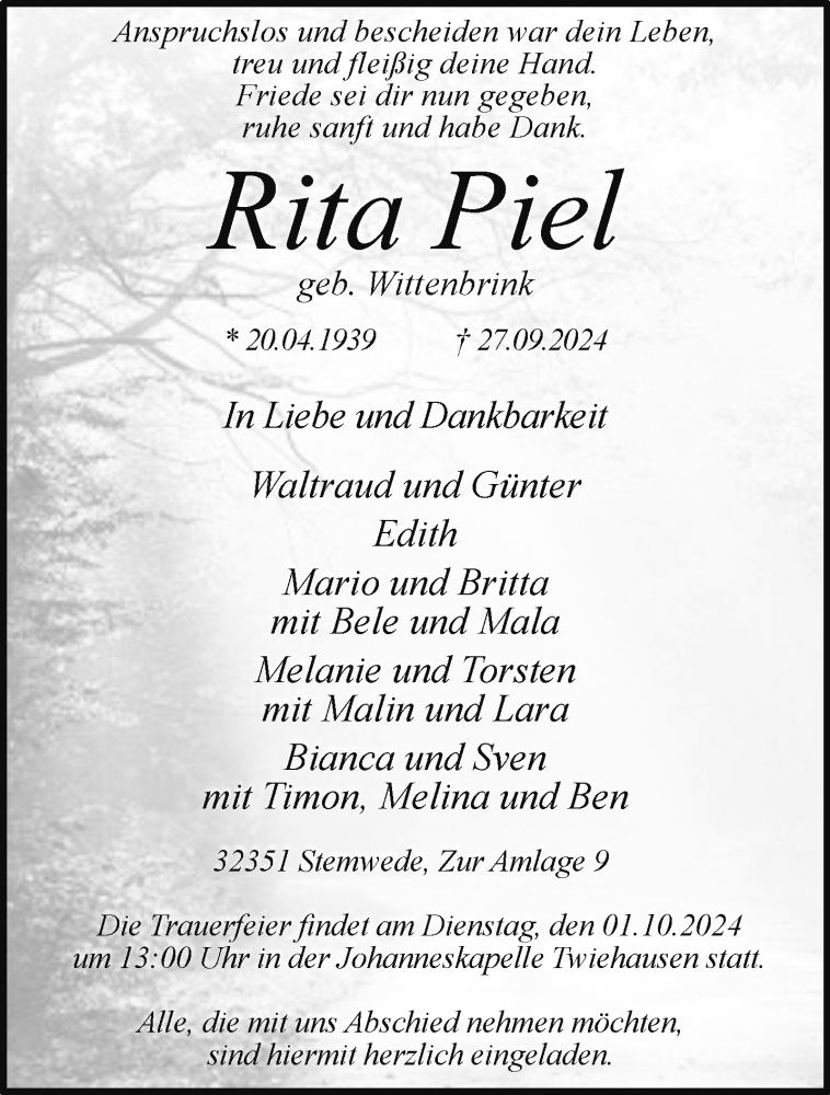 Hier finden Sie alle Traueranzeigen aus der Zeitung, die bisher für Rita Piel erschienen sind. Weitere Traueranzeigen, die in der Zeitung erscheinen, werden hier ebenfalls aufgelistet