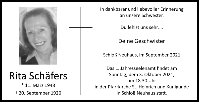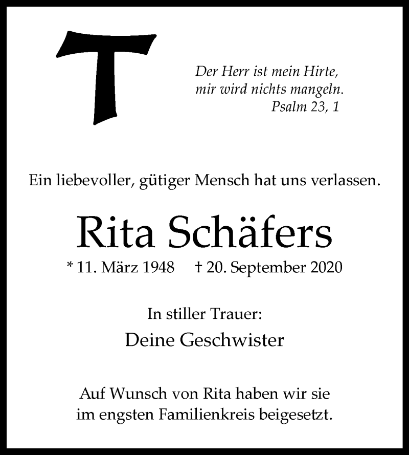Hier finden Sie alle Traueranzeigen aus der Zeitung, die bisher für Rita Schäfers erschienen sind. Weitere Traueranzeigen, die in der Zeitung erscheinen, werden hier ebenfalls aufgelistet