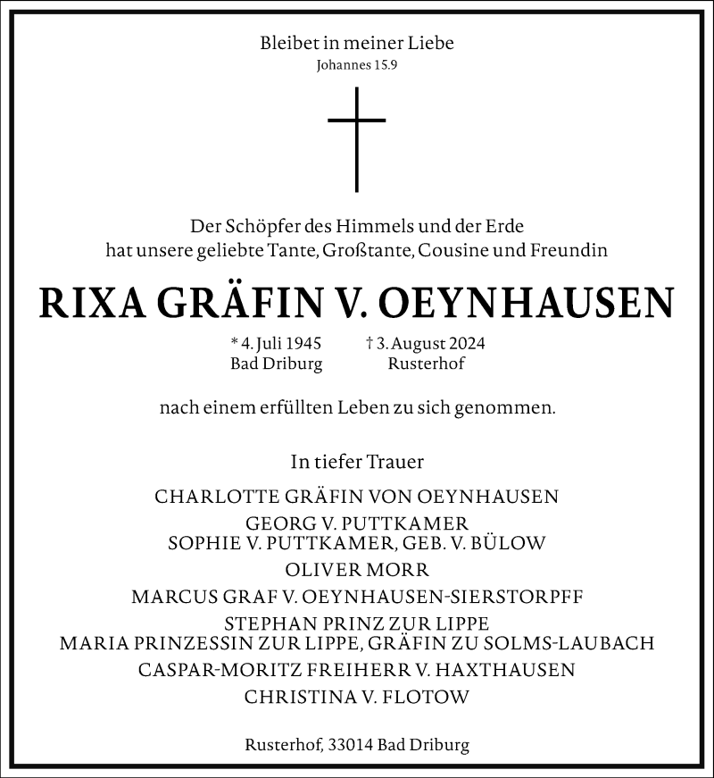 Hier finden Sie alle Traueranzeigen aus der Zeitung, die bisher für Rixa Gräfin v. Oeynhausen erschienen sind. Weitere Traueranzeigen, die in der Zeitung erscheinen, werden hier ebenfalls aufgelistet