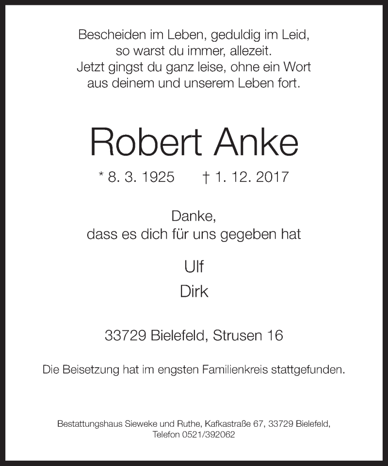 Hier finden Sie alle Traueranzeigen aus der Zeitung, die bisher für Robert Anke erschienen sind. Weitere Traueranzeigen, die in der Zeitung erscheinen, werden hier ebenfalls aufgelistet