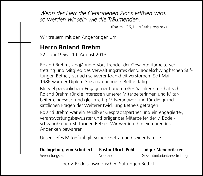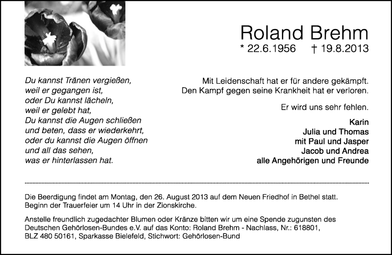 Hier finden Sie alle Traueranzeigen aus der Zeitung, die bisher für Roland Brehm erschienen sind. Weitere Traueranzeigen, die in der Zeitung erscheinen, werden hier ebenfalls aufgelistet