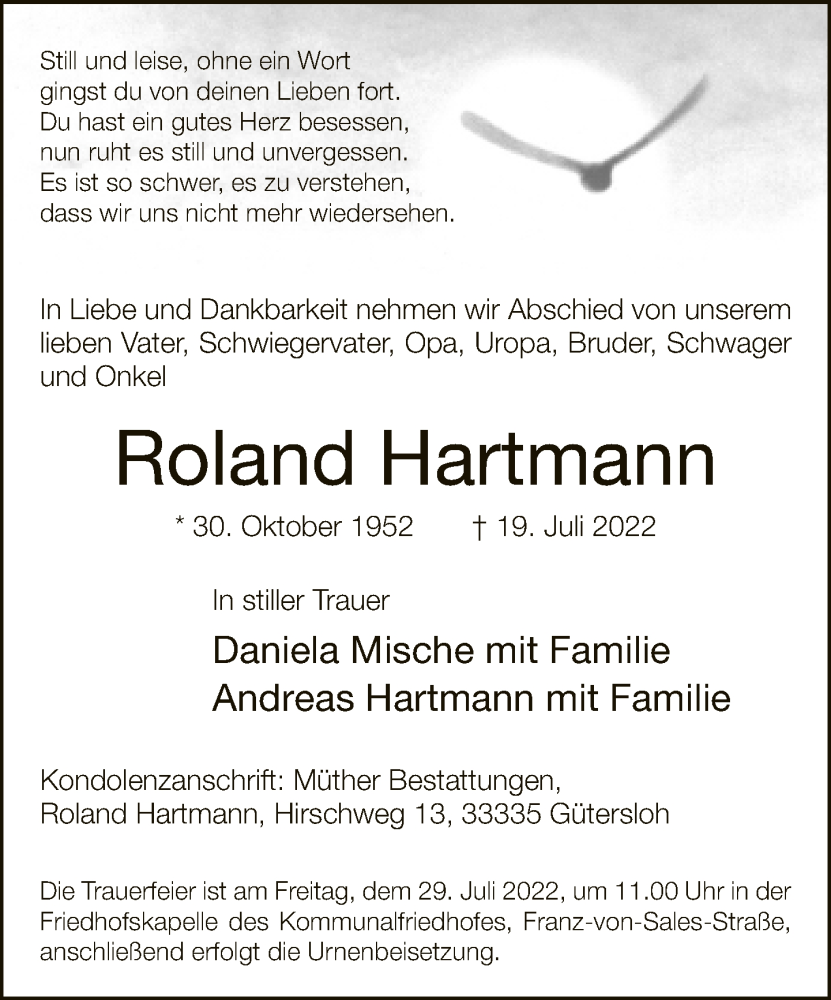 Hier finden Sie alle Traueranzeigen aus der Zeitung, die bisher für Roland Hartmann erschienen sind. Weitere Traueranzeigen, die in der Zeitung erscheinen, werden hier ebenfalls aufgelistet