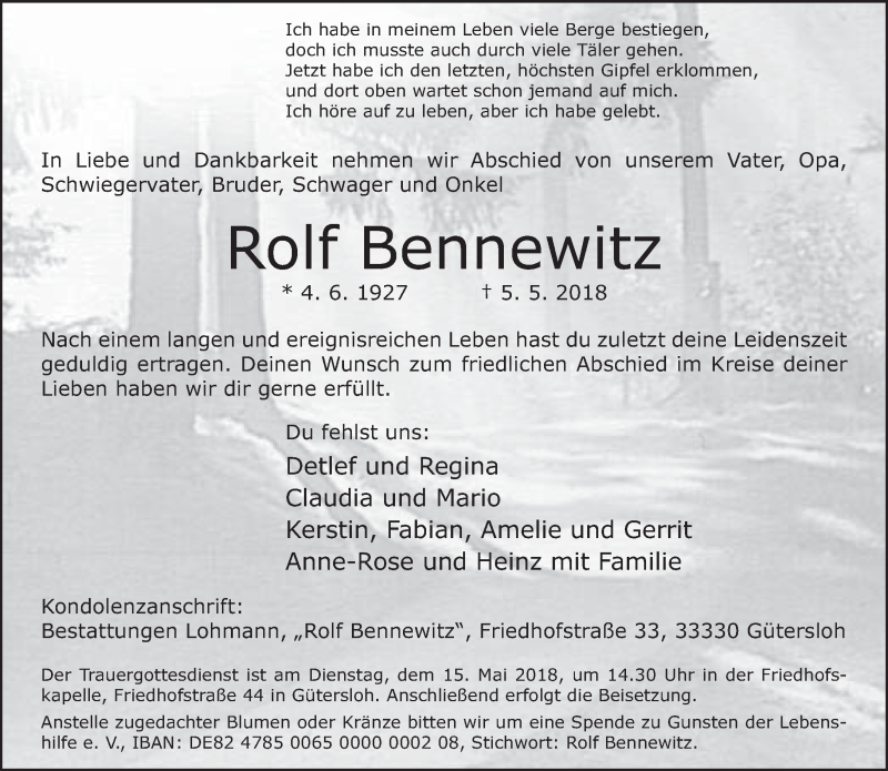 Hier finden Sie alle Traueranzeigen aus der Zeitung, die bisher für Rolf Bennewitz erschienen sind. Weitere Traueranzeigen, die in der Zeitung erscheinen, werden hier ebenfalls aufgelistet