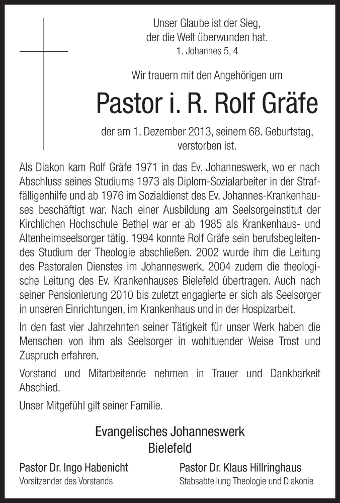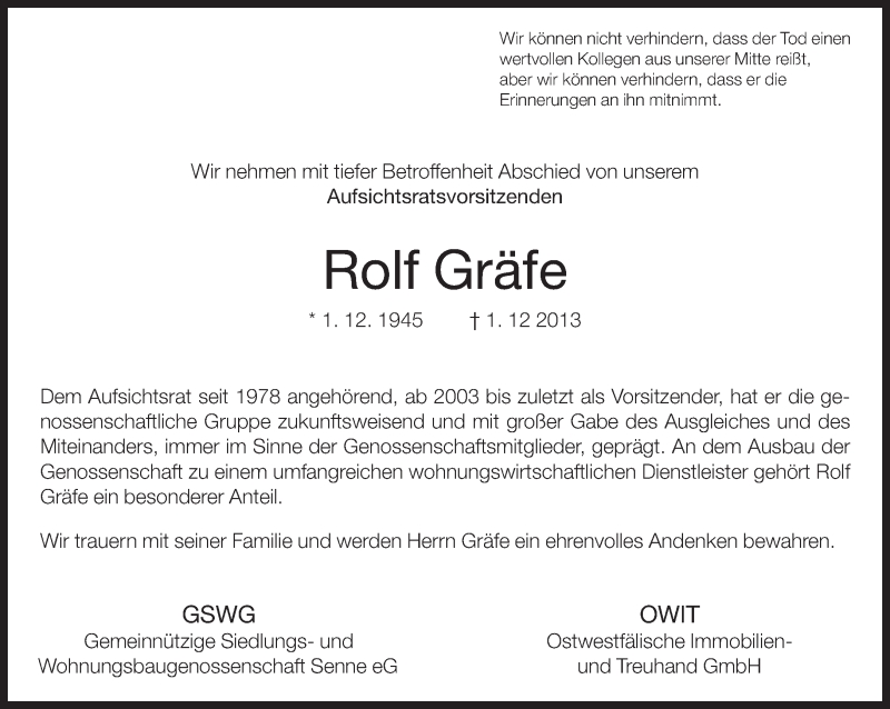 Hier finden Sie alle Traueranzeigen aus der Zeitung, die bisher für Rolf Gräfe erschienen sind. Weitere Traueranzeigen, die in der Zeitung erscheinen, werden hier ebenfalls aufgelistet