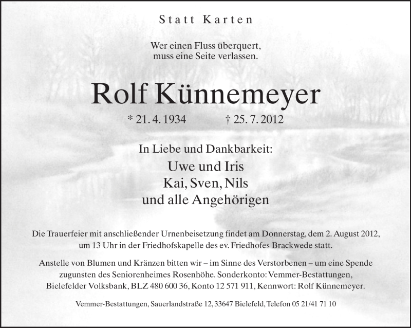 Hier finden Sie alle Traueranzeigen aus der Zeitung, die bisher für Rolf Künnemeyer erschienen sind. Weitere Traueranzeigen, die in der Zeitung erscheinen, werden hier ebenfalls aufgelistet