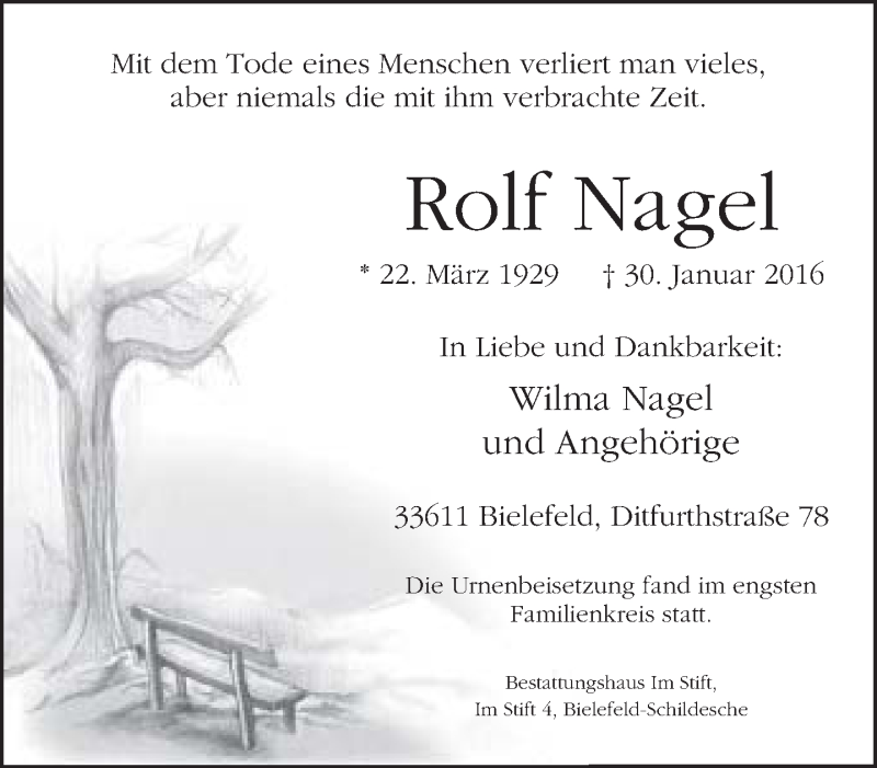 Hier finden Sie alle Traueranzeigen aus der Zeitung, die bisher für Rolf Nagel erschienen sind. Weitere Traueranzeigen, die in der Zeitung erscheinen, werden hier ebenfalls aufgelistet