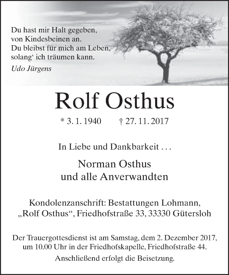Hier finden Sie alle Traueranzeigen aus der Zeitung, die bisher für Rolf Osthus erschienen sind. Weitere Traueranzeigen, die in der Zeitung erscheinen, werden hier ebenfalls aufgelistet
