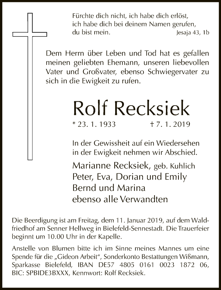 Hier finden Sie alle Traueranzeigen aus der Zeitung, die bisher für Rolf Recksiek erschienen sind. Weitere Traueranzeigen, die in der Zeitung erscheinen, werden hier ebenfalls aufgelistet