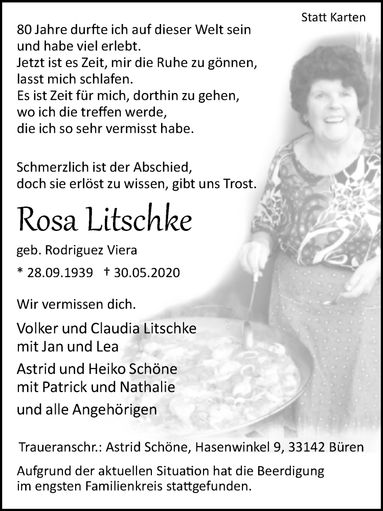 Hier finden Sie alle Traueranzeigen aus der Zeitung, die bisher für Rosa Litschke erschienen sind. Weitere Traueranzeigen, die in der Zeitung erscheinen, werden hier ebenfalls aufgelistet