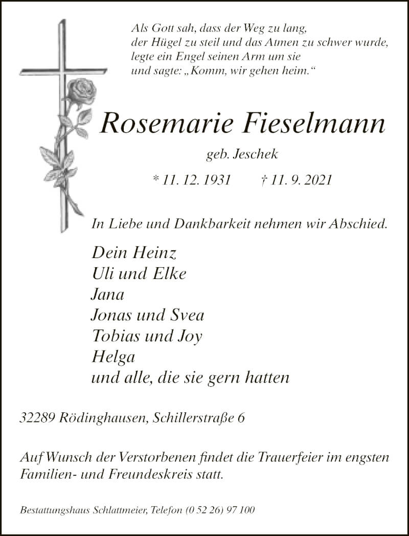 Hier finden Sie alle Traueranzeigen aus der Zeitung, die bisher für Rosemarie Fieselmann erschienen sind. Weitere Traueranzeigen, die in der Zeitung erscheinen, werden hier ebenfalls aufgelistet