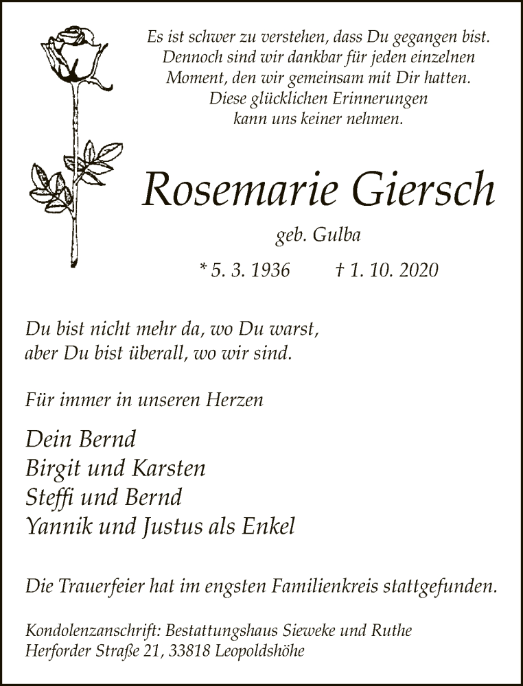 Hier finden Sie alle Traueranzeigen aus der Zeitung, die bisher für Rosemarie Giersch erschienen sind. Weitere Traueranzeigen, die in der Zeitung erscheinen, werden hier ebenfalls aufgelistet