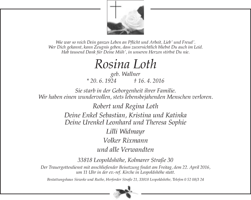 Hier finden Sie alle Traueranzeigen aus der Zeitung, die bisher für Rosina Loth erschienen sind. Weitere Traueranzeigen, die in der Zeitung erscheinen, werden hier ebenfalls aufgelistet