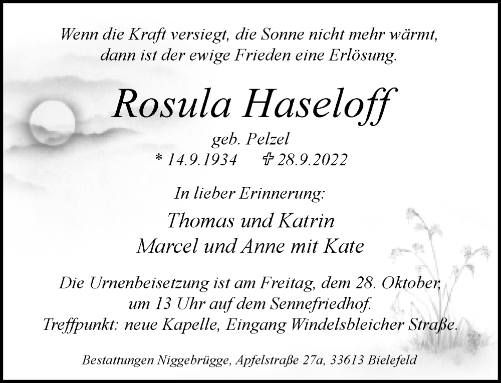 Hier finden Sie alle Traueranzeigen aus der Zeitung, die bisher für Rosula Haseloff erschienen sind. Weitere Traueranzeigen, die in der Zeitung erscheinen, werden hier ebenfalls aufgelistet