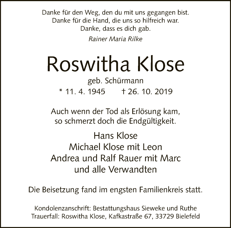 Hier finden Sie alle Traueranzeigen aus der Zeitung, die bisher für Roswitha Klose erschienen sind. Weitere Traueranzeigen, die in der Zeitung erscheinen, werden hier ebenfalls aufgelistet