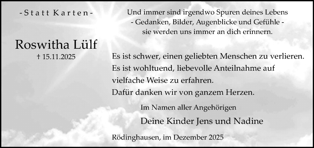 Hier finden Sie alle Traueranzeigen aus der Zeitung, die bisher für Roswitha Lülf erschienen sind. Weitere Traueranzeigen, die in der Zeitung erscheinen, werden hier ebenfalls aufgelistet