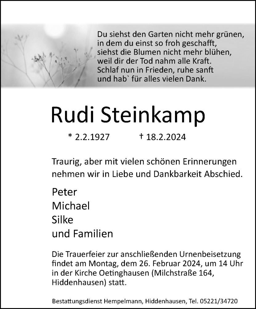 Hier finden Sie alle Traueranzeigen aus der Zeitung, die bisher für Rudi Steinkamp erschienen sind. Weitere Traueranzeigen, die in der Zeitung erscheinen, werden hier ebenfalls aufgelistet