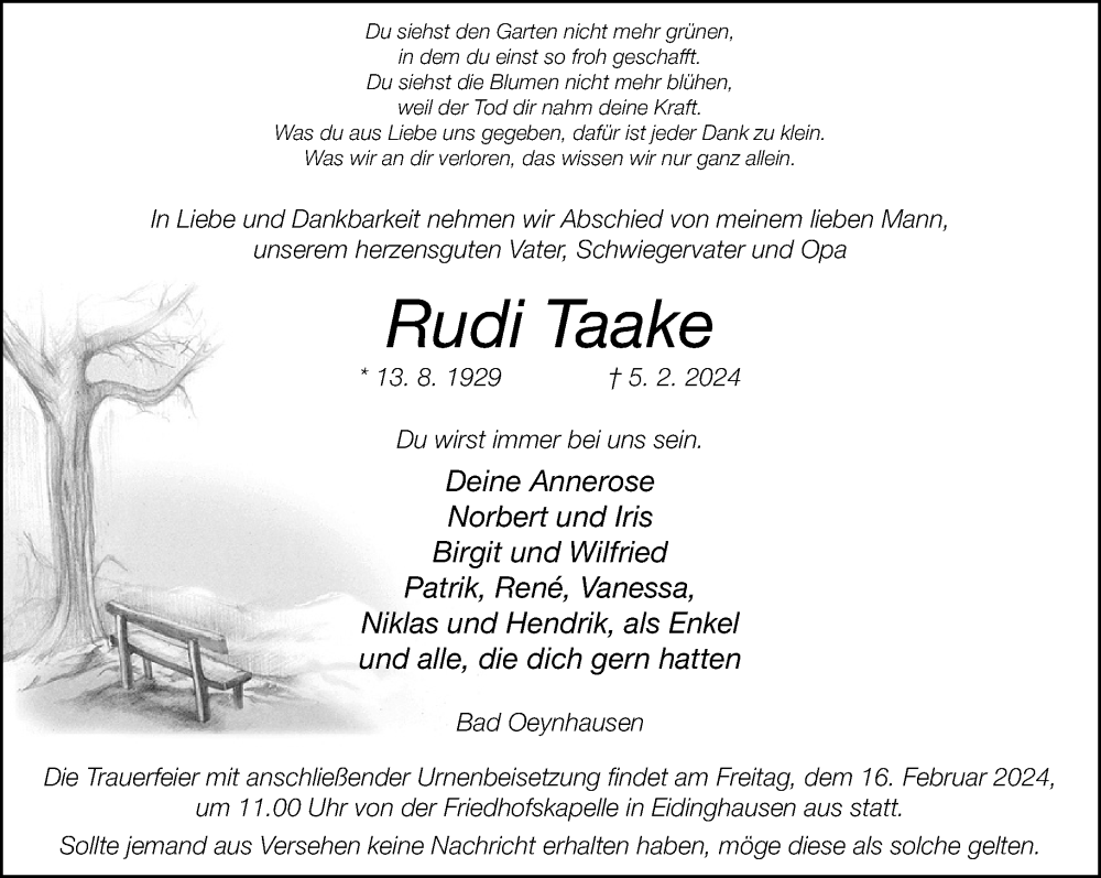Hier finden Sie alle Traueranzeigen aus der Zeitung, die bisher für Rudi Taake erschienen sind. Weitere Traueranzeigen, die in der Zeitung erscheinen, werden hier ebenfalls aufgelistet