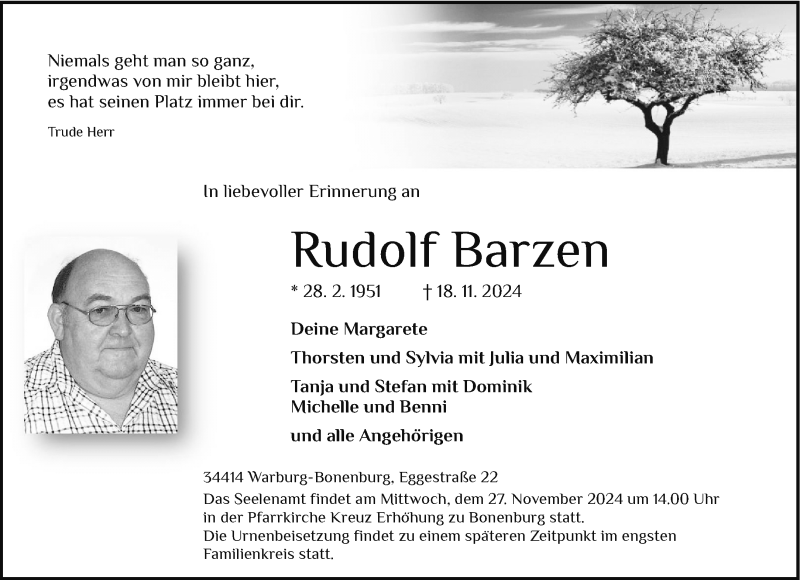 Hier finden Sie alle Traueranzeigen aus der Zeitung, die bisher für Rudolf Barzen erschienen sind. Weitere Traueranzeigen, die in der Zeitung erscheinen, werden hier ebenfalls aufgelistet
